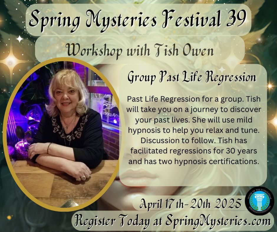 Past Life Regression for a group. Tish will take you on a journey to discover your past lives. She will use mild hypnosis to help you relax and tune. Discussion to follow. Tish has facilitated regressions for 30 years and has two hypnosis certifications.